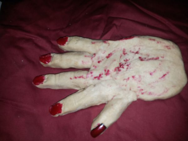 Fake Blood Recipe– 3 cups water, 2 2/3 cups flour, 2 tablespoons red food coloring, 1/4 teaspoon green food coloring, 3 cups vegetable oil, 2/3 cup cocoa powder.
